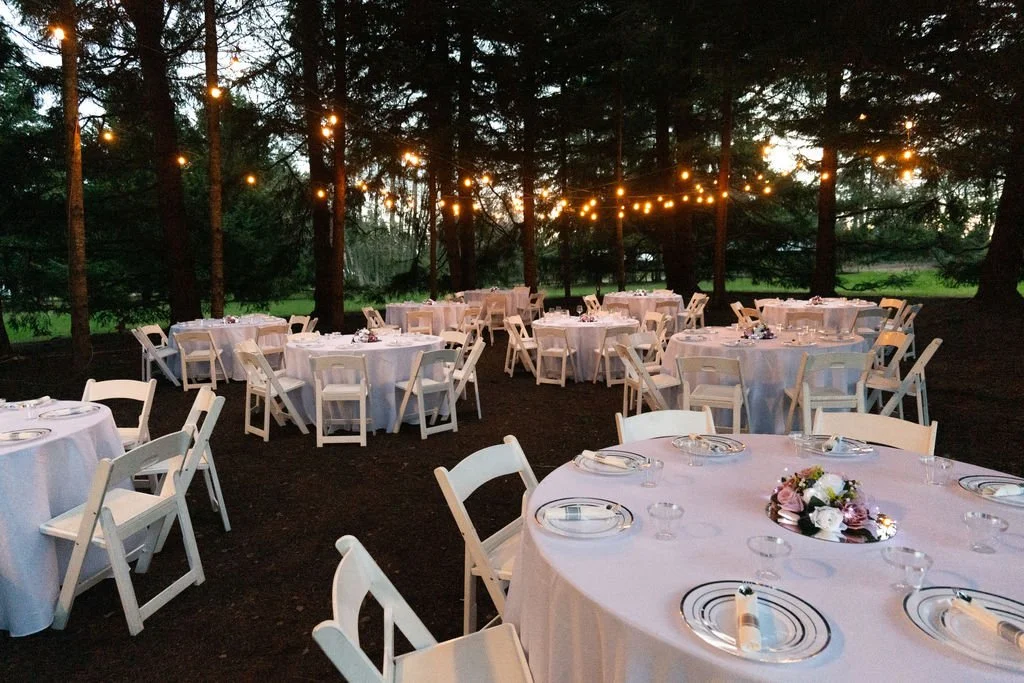 A magical circle of majestic Douglas Fir trees, nestled within a beautiful meadow. Rustic and refined, it can serve as a romantic place to exchange vows, a relaxed space for a reception dinner, or a fun dance area with a stage and sound equipment.
